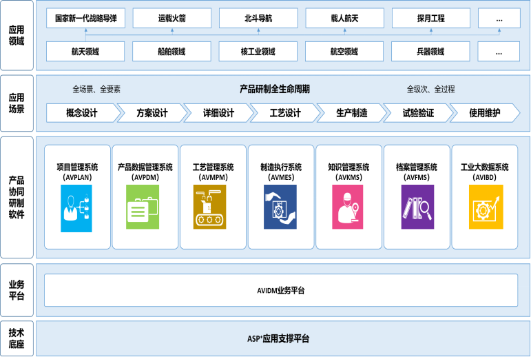 公司憑借在航天及國防軍工等復雜裝備研制信息化領域30余年的積累和實踐,形成了以AVIDM為品牌的核心工業(yè)軟件產(chǎn)品體系。AVIDM系列軟件主要包括項目管理系統(tǒng) (AVPLAN)、產(chǎn)品數(shù)據(jù)管理系統(tǒng)(AVPDM)、工藝管理系統(tǒng)(AVMPM)、制造執(zhí)行系統(tǒng)(AVMES)、知識管理系統(tǒng)(AVKMS)、數(shù)字檔案管理系統(tǒng)(AVFMS)和工業(yè)大數(shù)據(jù)系統(tǒng)(AVIBD)等子產(chǎn)品。